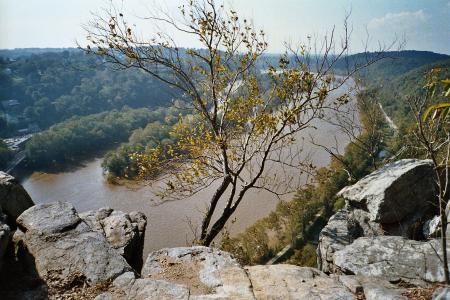 The Potomac from the Maryland Heights Trail. The canal towpath can easily be seen on the right. {04-09E35} Harper's Ferry |